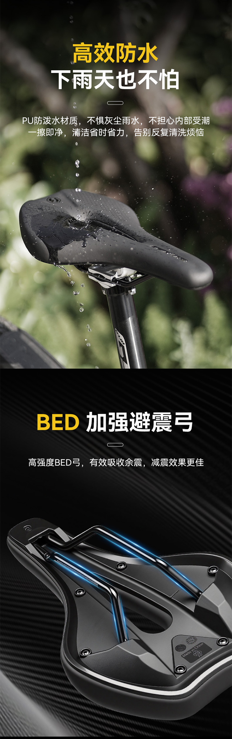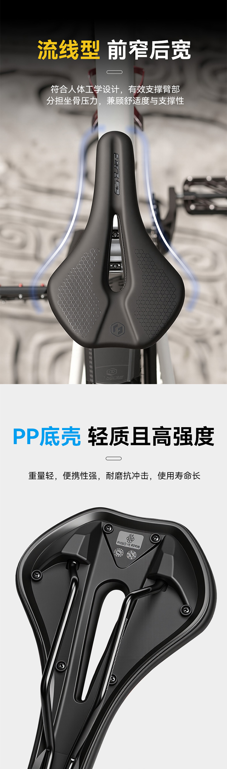 材质:PP底壳+高回弹聚氨酯发泡+BED弓