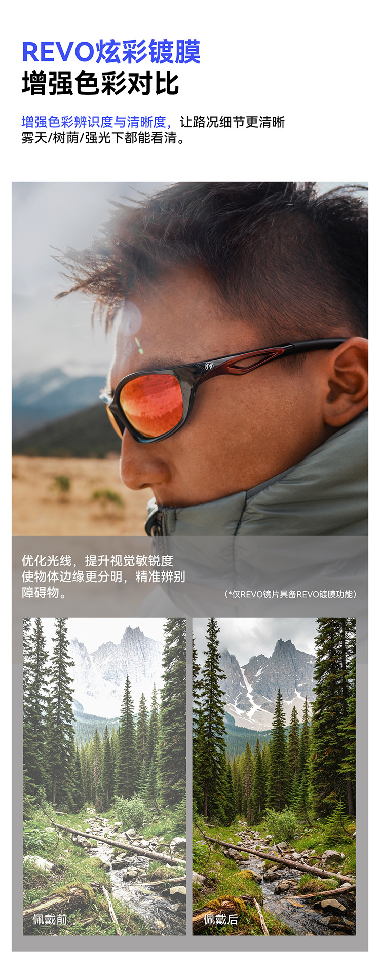 卖点:REVO炫彩镀膜(*仅REVO镜片具备REVO镀膜功能)、独特镂空镜腿设计、可调节鼻托、防滑橡胶镜腿、轻量化
